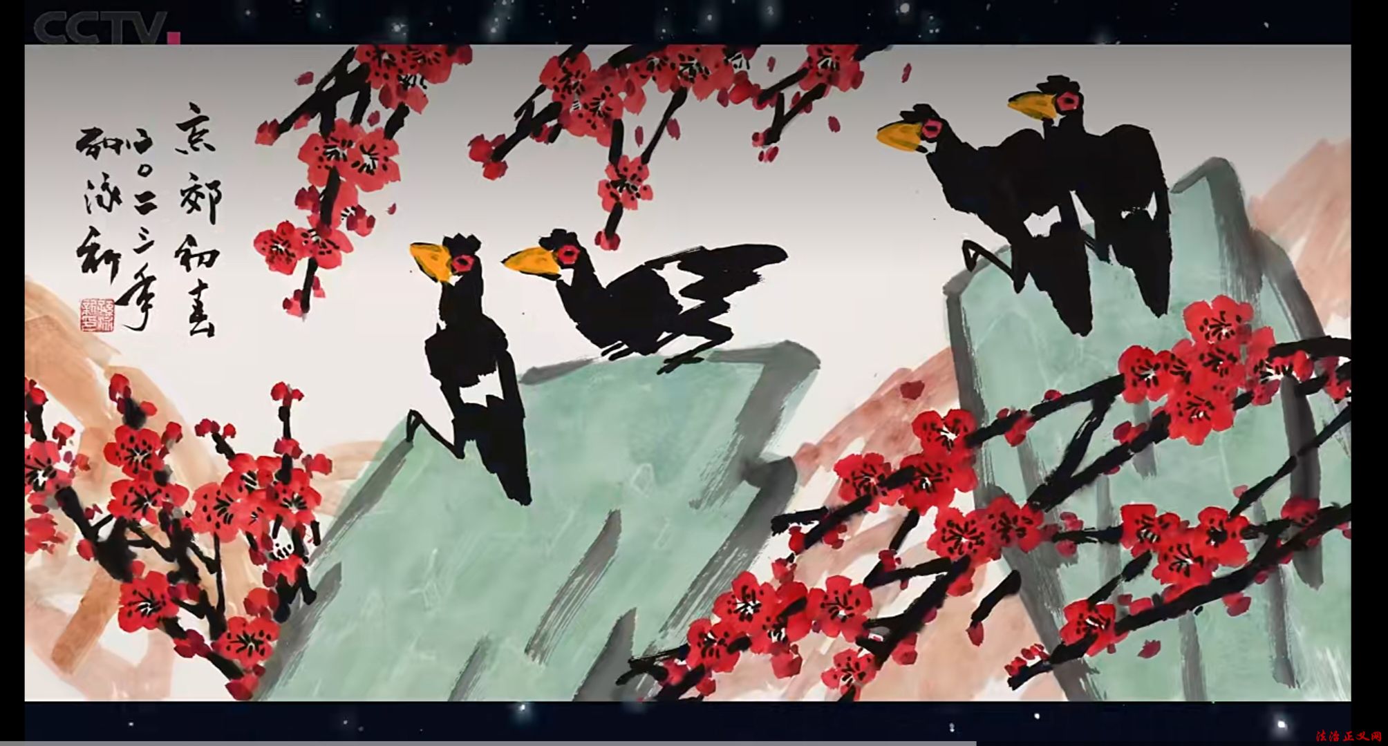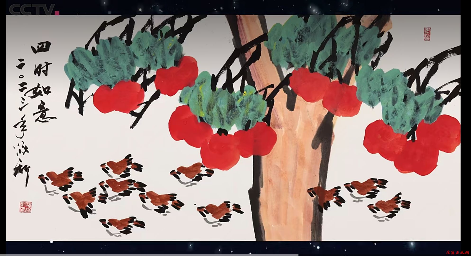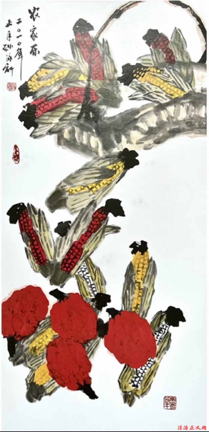 用色:创新墨色融合——或以墨衬色,或以色破墨,大胆运用大红大绛等对比色,艳而不俗,凸显时代气息(如《高粱红了国酒香》)。
