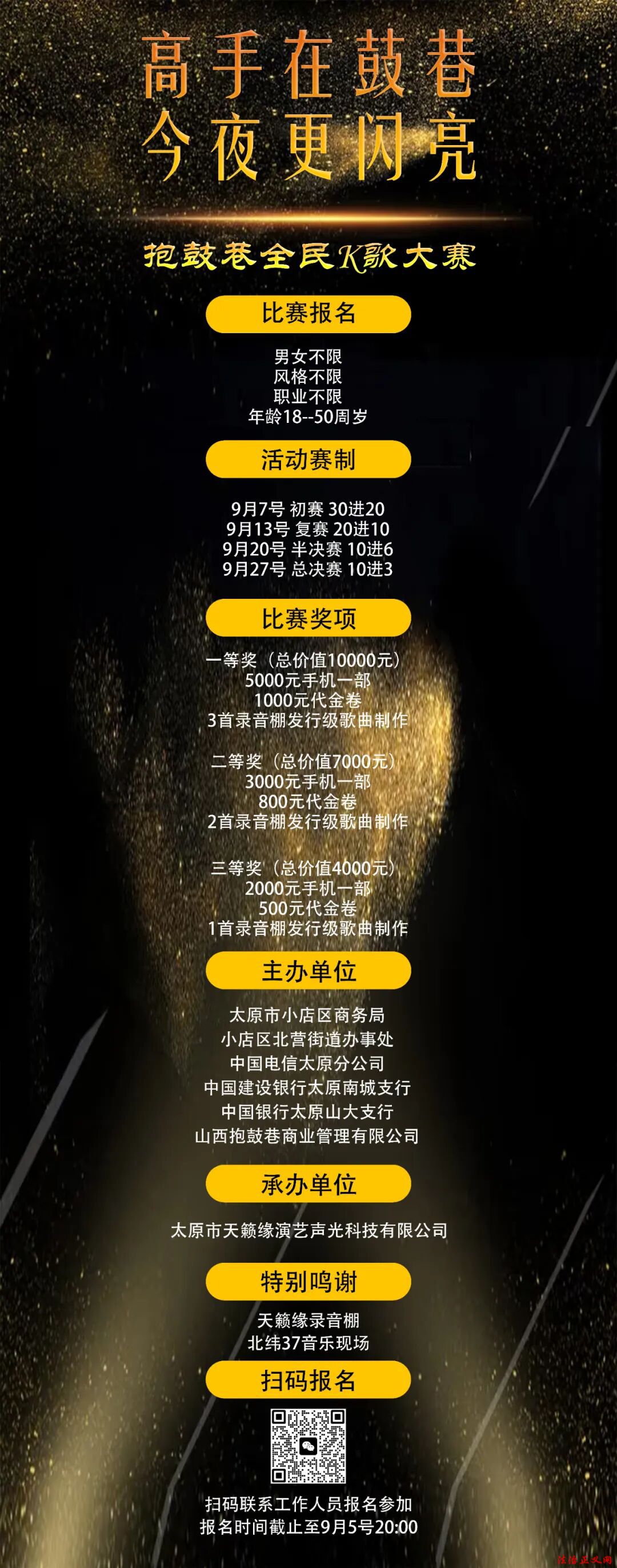 目前,大赛报名通道已开启,扫码即可报名参加,报名时间截止至9月5日20:00。让我们共同期待这场全民参与的K歌盛宴,在抱鼓巷吃着美食、听着歌声,享受美好夜生活,用欢乐为城市夜经济赋能,为文化城市建设添彩。