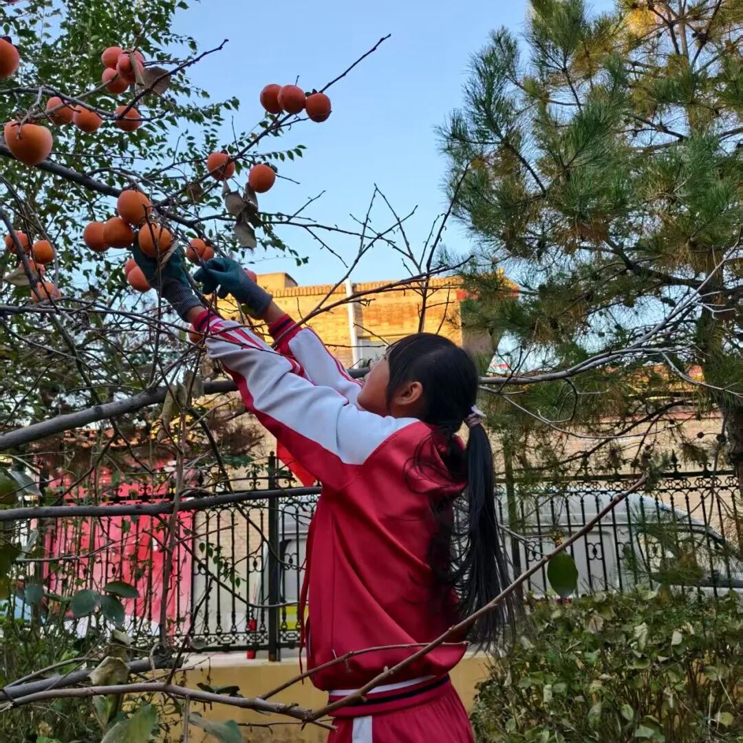 走进“春华秋实路”:孩子们仰着头穿梭林间,目光追随着由浅黄渐深至橘红的果实轨迹。“老师快看!这个柿子像小太阳!”稚嫩的声音里满是惊叹。他们小心翼翼地托起沉甸甸的果子,指尖触碰果皮时感受到的柔软触感引发阵阵欢笑。