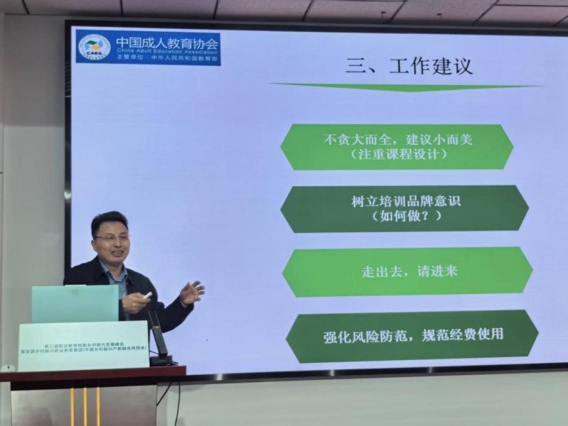 中国成人教育协会乡村振兴专委会秘书长姜明房做《乡村振兴村民培训课程体系的几点思考》的主题演讲。