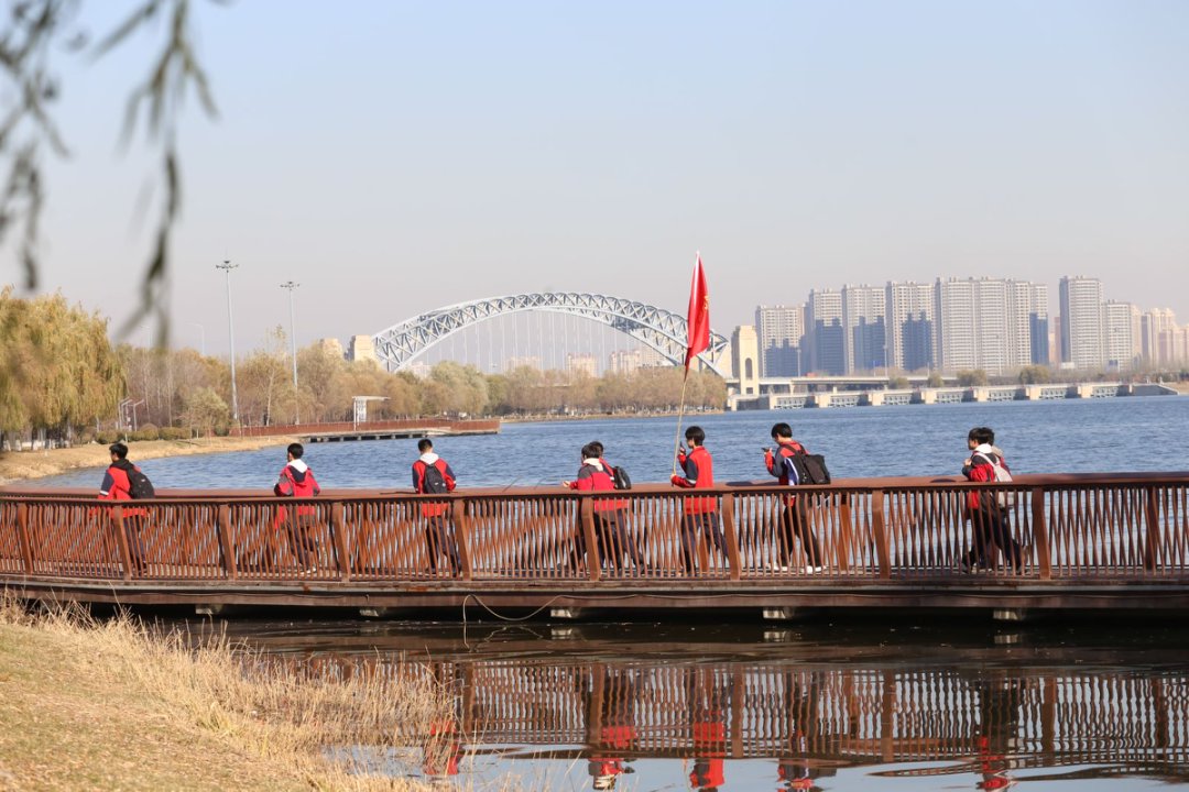行进途中,同学们暂别书山题海,沉浸于汾河沿岸的冬日景致。途经晋阳桥与迎宾桥两座标志性跨河大桥,大家或拍照留念,或驻足远眺,欢声笑语与河风一同拂去了备考的紧张与疲惫。中途休整期间,各班组织了“两人三足”、“接力传球”等趣味团建游戏,同学们在默契配合中增进情谊,在欢声笑语中舒缓压力,展现出久违的轻松与喜悦。