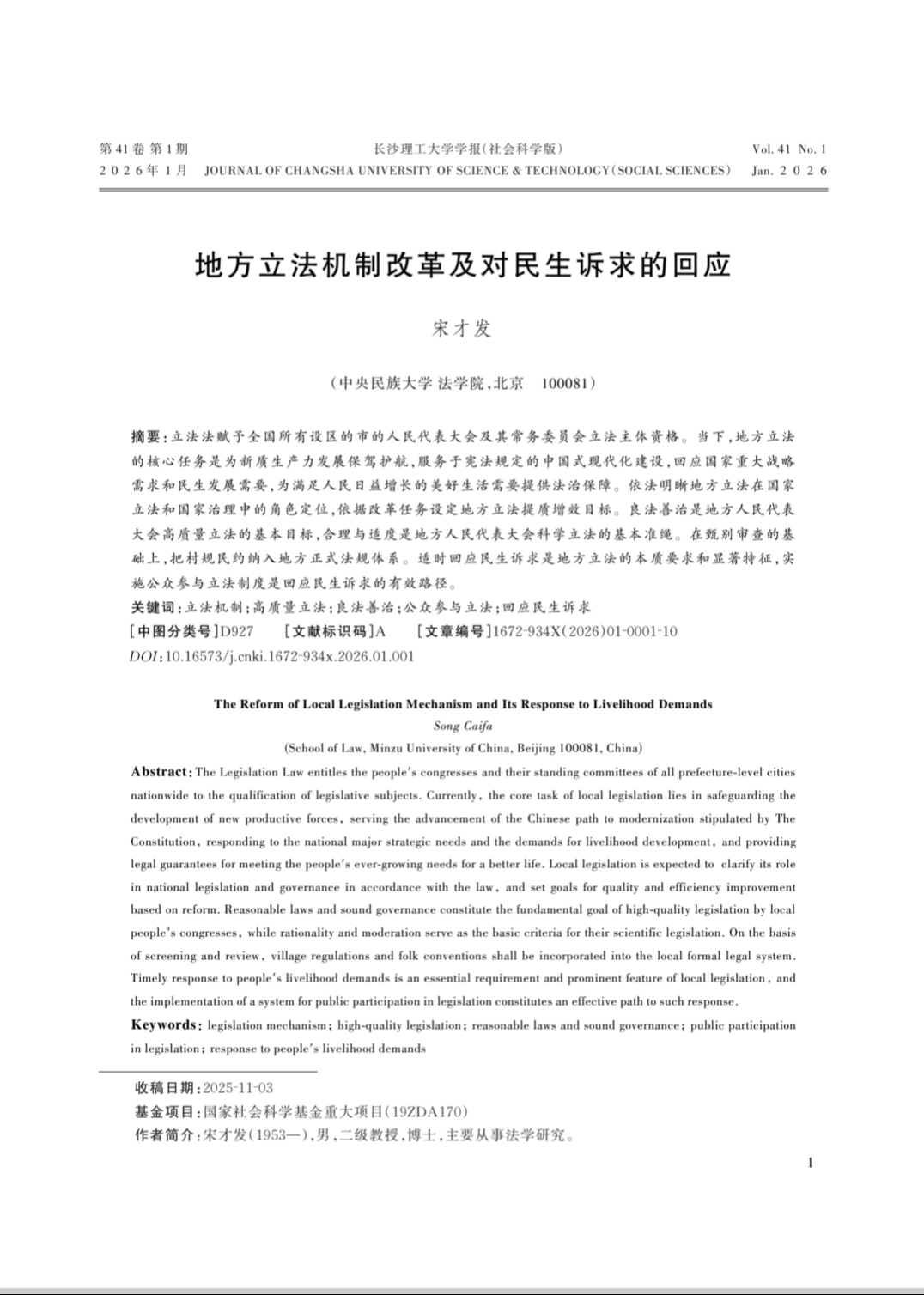 标准参考文献:宋才发.地方立法机制改革及对民生诉求的回应[J].长沙理工大学学报(社会科学版),2026(1):1-10.